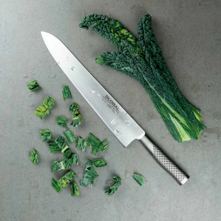 Global GF-35 Kokkiveitsi 30 cm taottu on valmistettu Cromova 18 ruostumattomasta teräksestä ja sen terässä on painoa, mikä helpottaa lihan tai juuresten käsittelyä. Monipuolista veistä voidaan käyttää leikkaamiseen, pilkkomiseen tai kuutioimiseen useimpien raaka-aineiden kanssa.