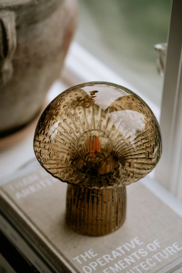 Fungo pöytävalaisin Special Edition ruskea Globen Lightingiltä on innovatiivinen lamppu, jossa on selkeitä vaikutteita metsästä ja sienestä. Lasinen lamppu on uurrettu jalusta, jossa uurteet jatkuvat koko matkalta lampunvarjon alle, aivan kuten lakkisienen lamellit. Yhdistä Fungo sopivaan valonlähteeseen ja aseta ikkunalaudalle tai yöpöydälle, missä lamppu luo kodikkaan hehkun huoneeseen